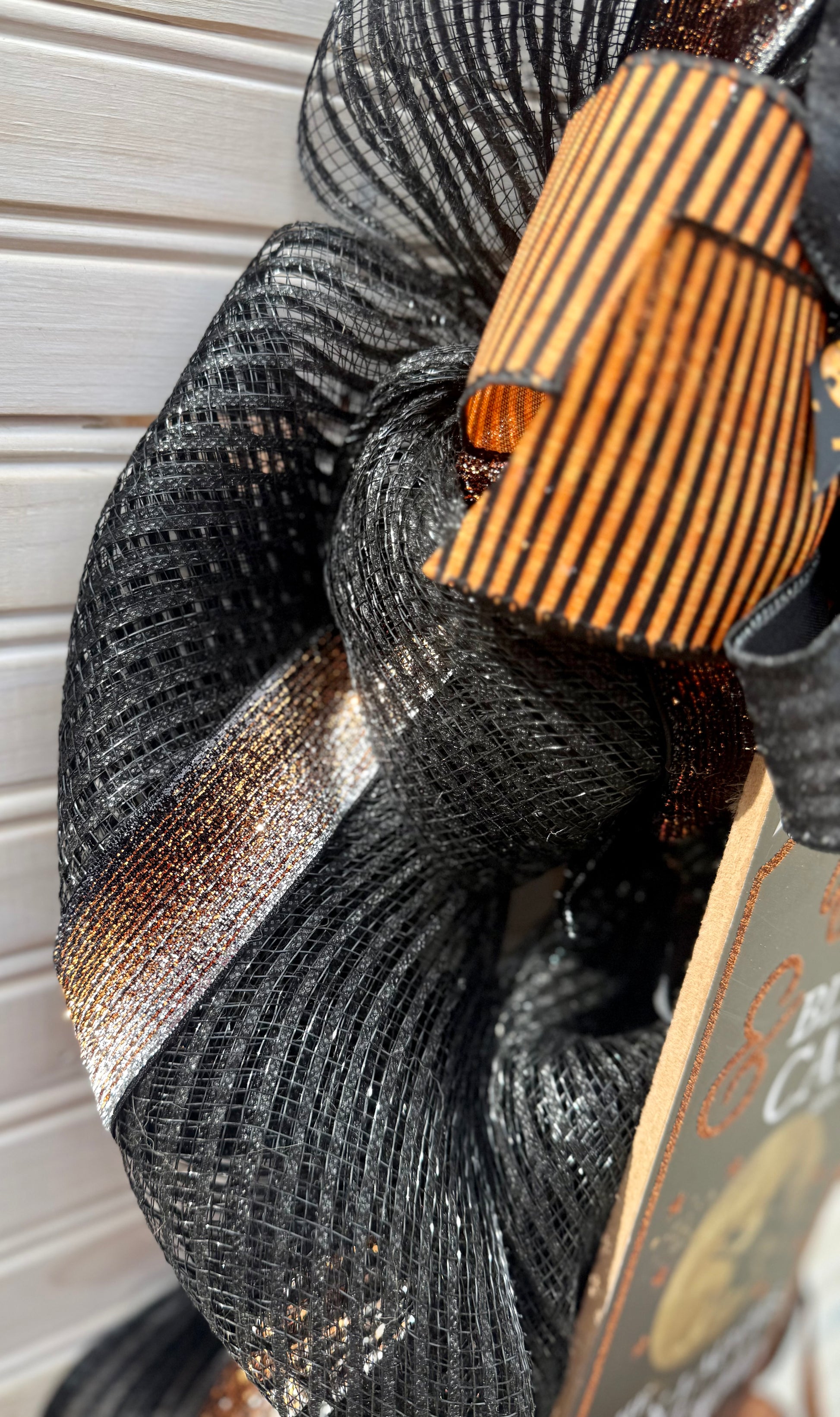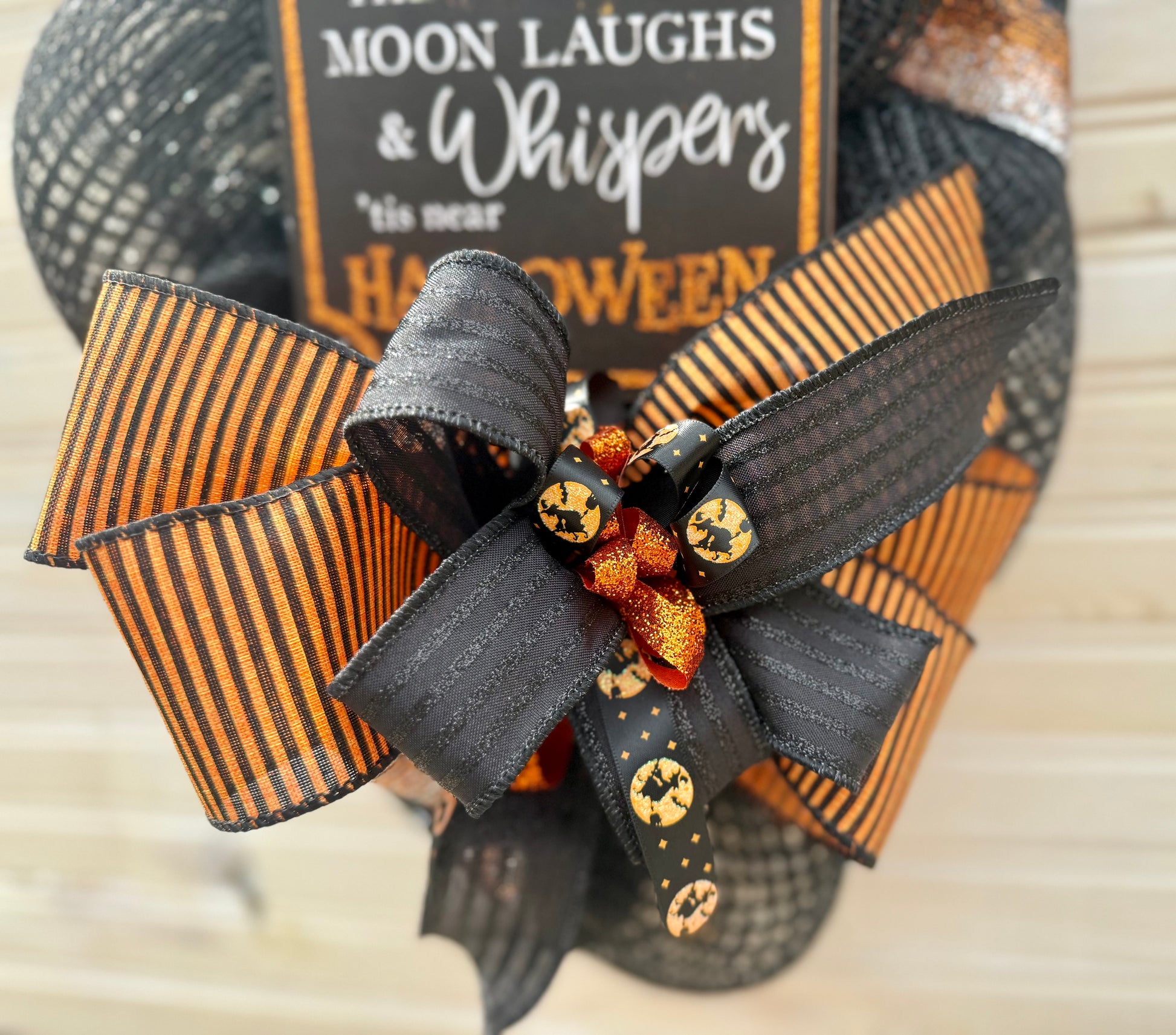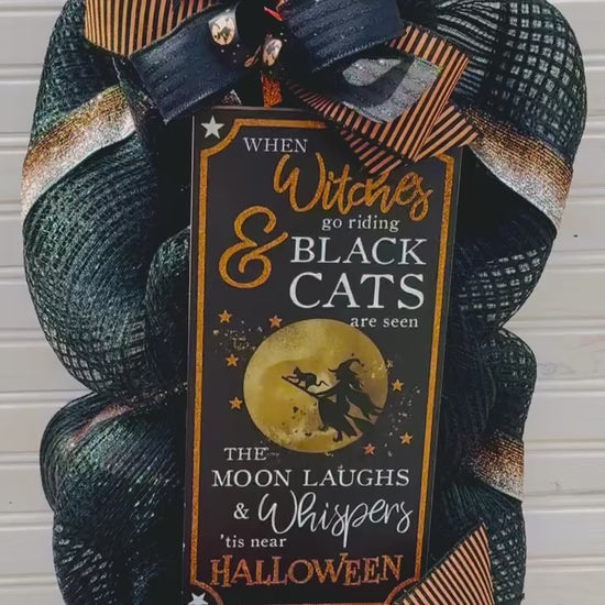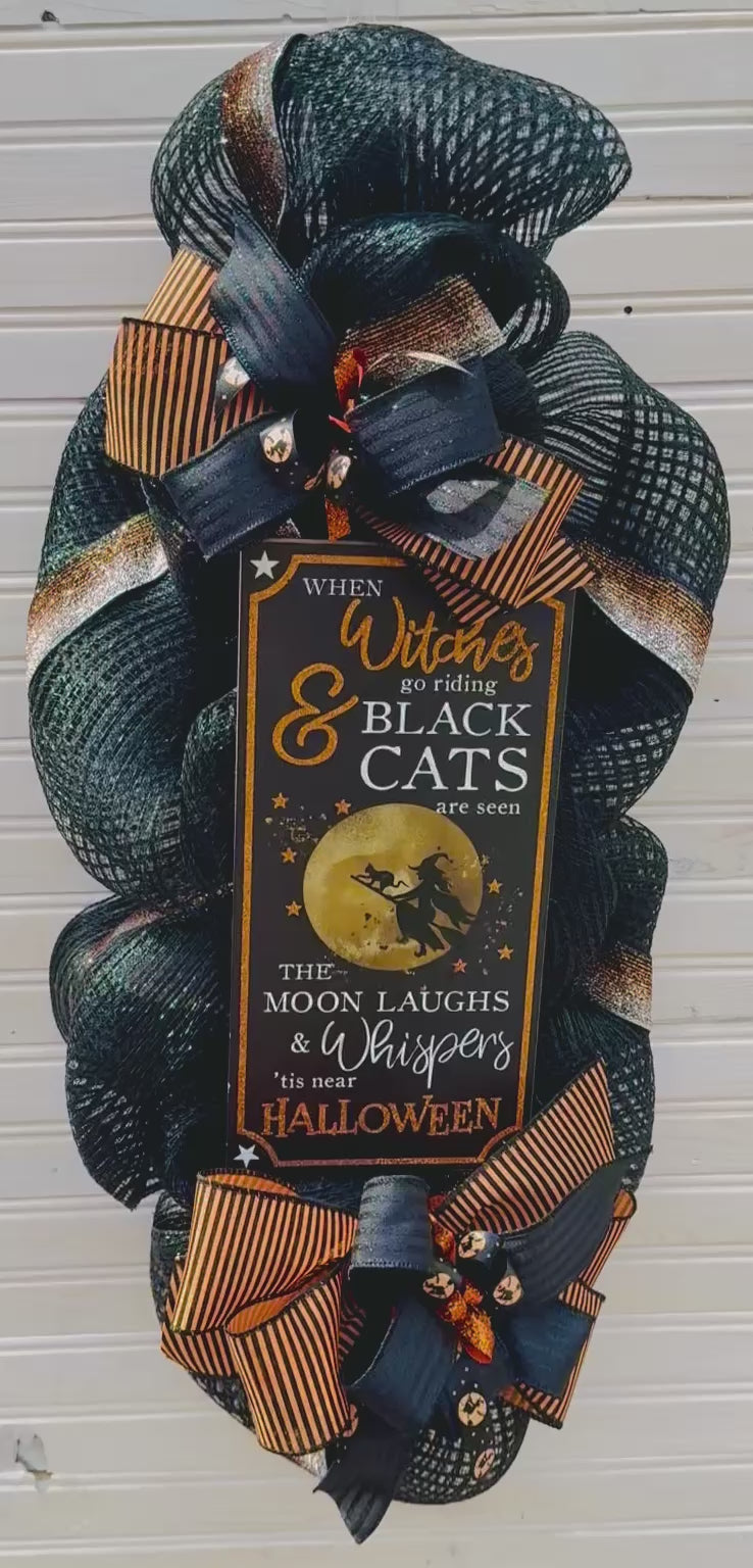 Add a touch of spooky elegance to your Halloween décor with this handmade swag measuring 26 x 13 inches. Designed with layered black mesh, glittered ribbon, and festive bows, it features a whimsical wooden sign that reads: “When witches go riding & black cats are seen, the moon laughs & whispers ’tis near Halloween.” Perfect for front doors, entryways, or indoor displays, this Halloween swag is a charming way to welcome trick-or-treaters and guests with seasonal style.