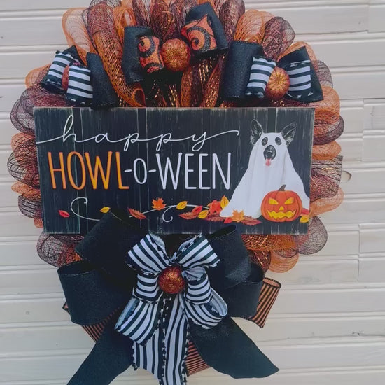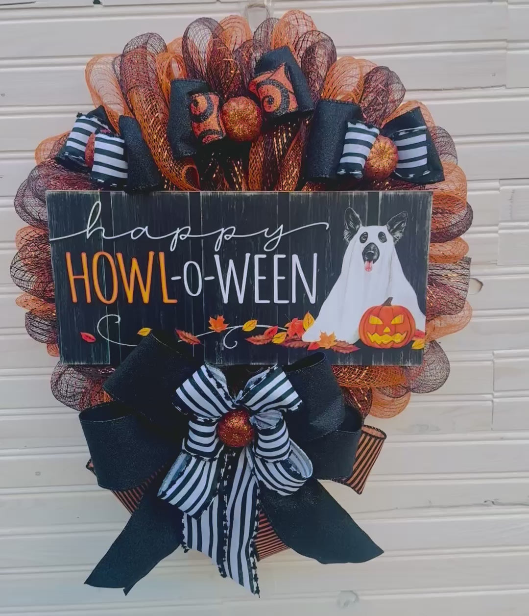 Happy HOWL-o-Ween Dog Halloween Wreath β Mesh Front Door Decor with Dog Ghost Sign