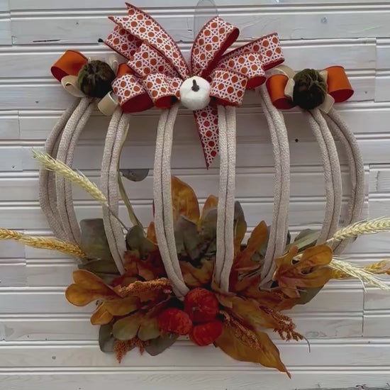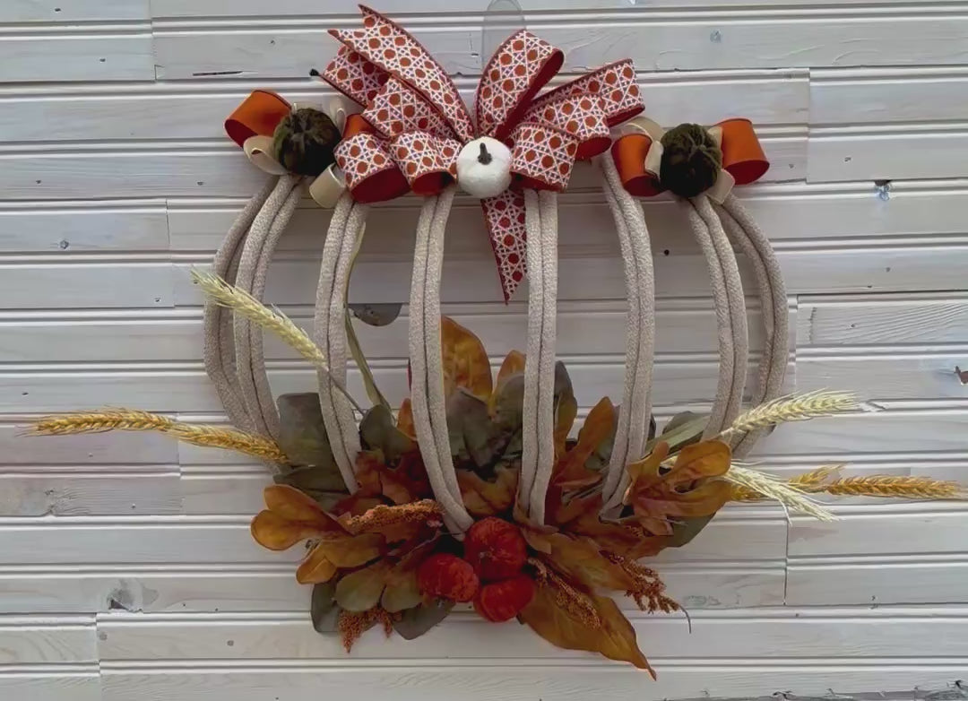 Bring cozy autumn charm to your home with this pumpkin-shaped fall door hanger. Measuring 16x18 inches, this handcrafted wreath features rustic neutral pumpkin outlines, warm orange accents, velvet pumpkins, wheat stems, and lush fall foliage. Topped with a festive bow, it’s the perfect front door wreath for autumn, Thanksgiving, or farmhouse décor. A beautiful way to welcome guests and celebrate the season.