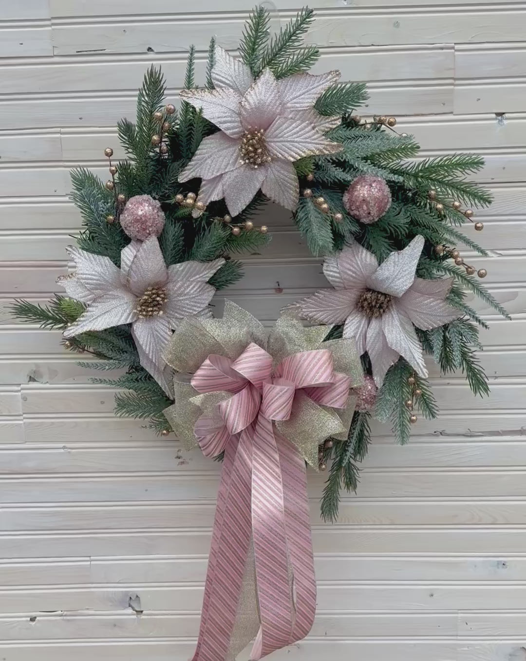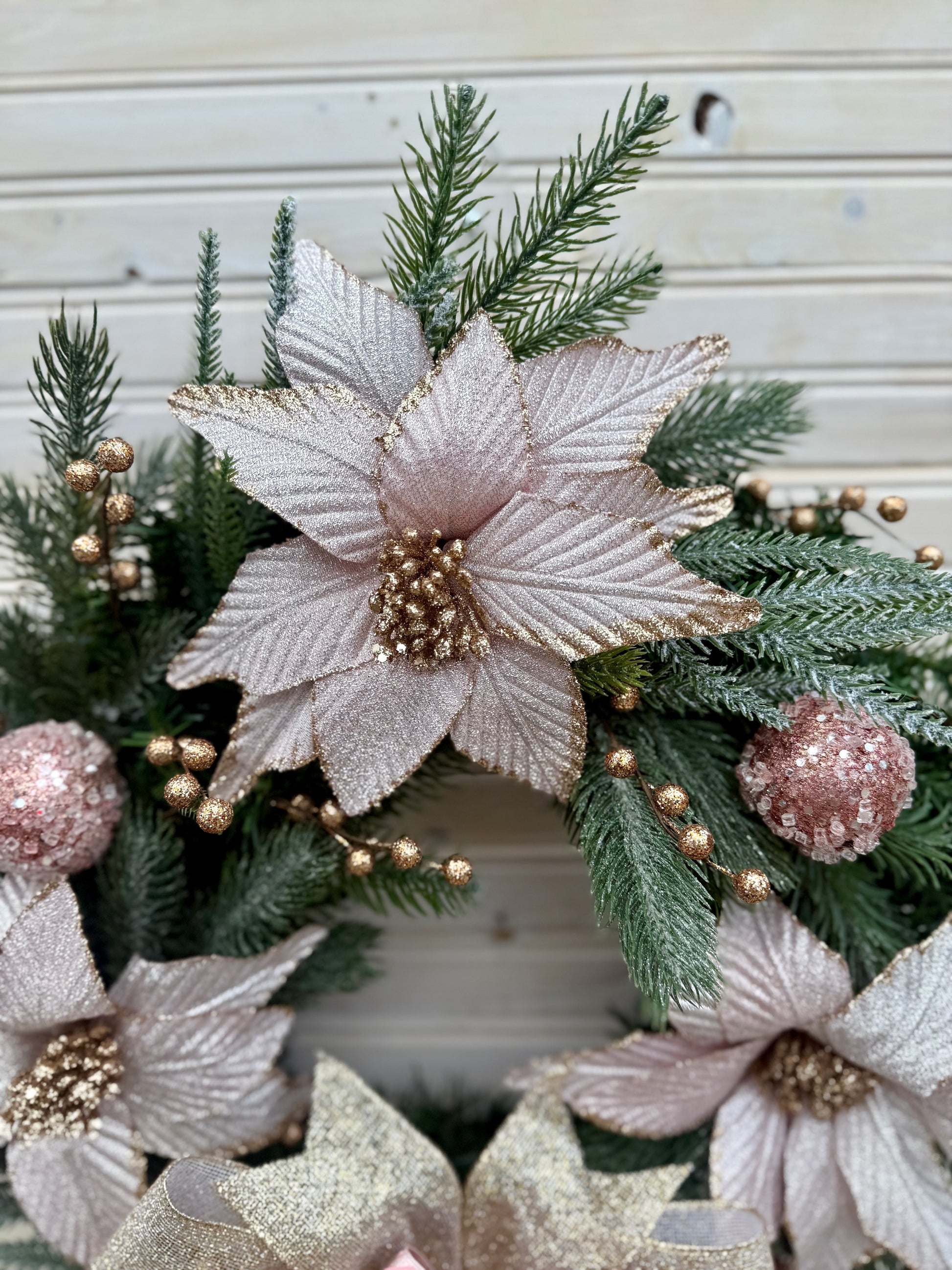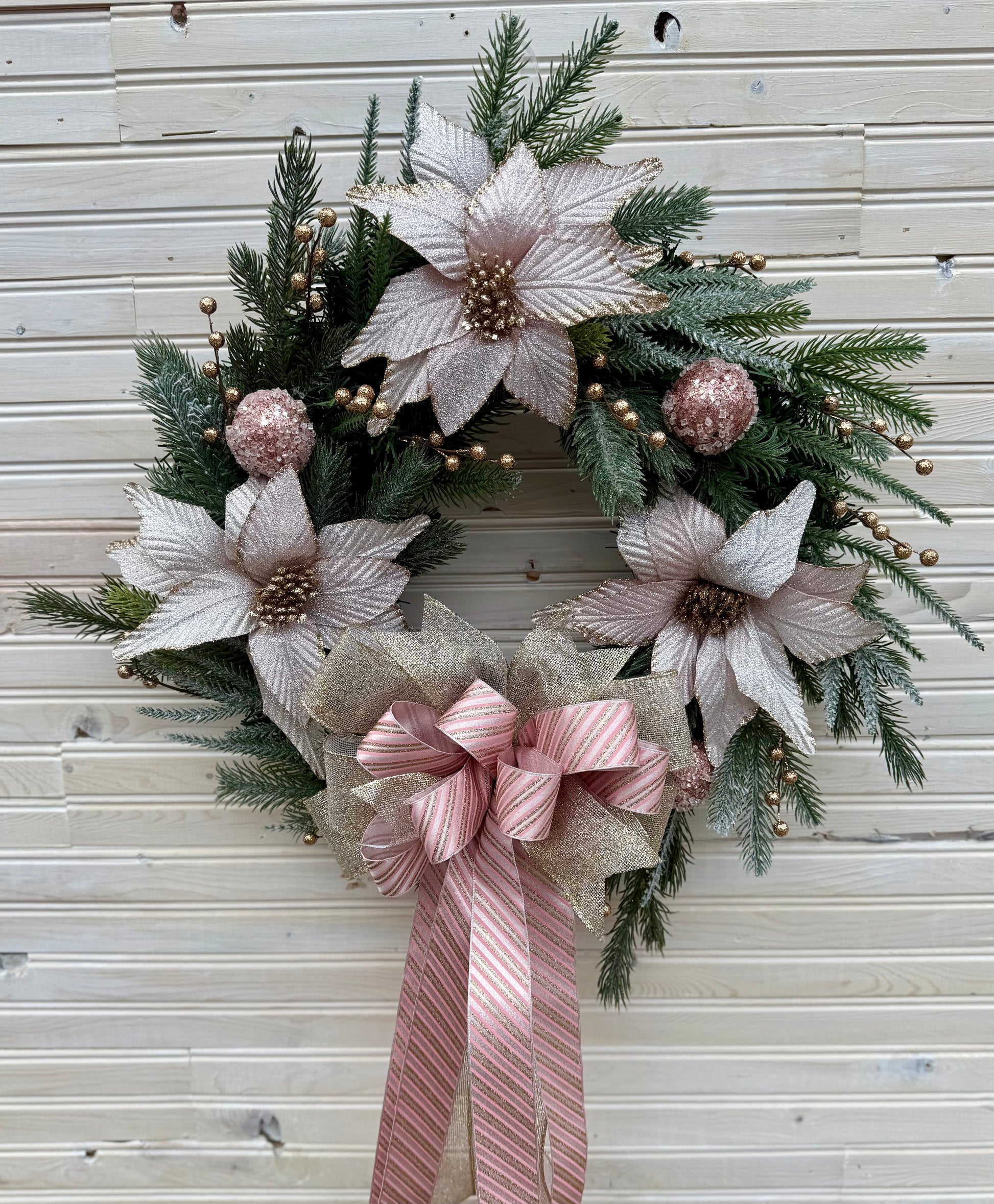 This 22” winter wreath combines blush poinsettias, shimmering ornaments, and elegant ribbon tails for a timeless, feminine holiday look. A lovely statement piece for any entryway.