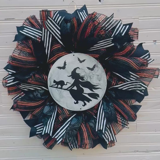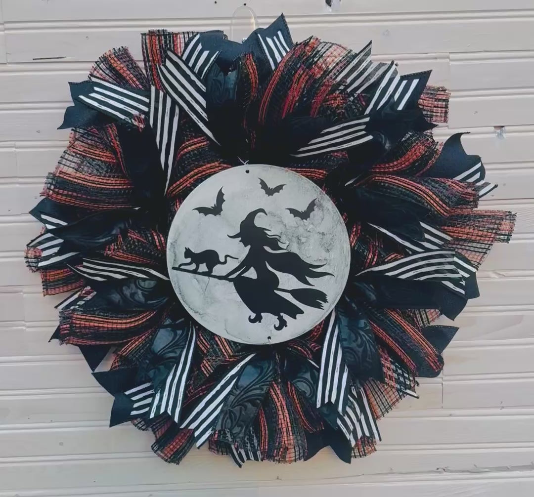 Bring a touch of Halloween magic to your home with this handcrafted witch and cat wreath, set against a silvery moon with flying bats. Designed with layers of black and orange mesh, striped ribbons, and embossed accents, this wreath offers bold Halloween style in a slim, space-saving design — perfect for fitting between most front doors and storm doors. A striking piece that adds a spooky yet elegant touch to your seasonal decor!